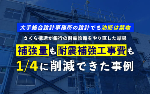 大手総合設計事務所の設計でも油断は禁物。さくら構造が銀行の耐震診断をやり直した結果、補強量も耐震補強工事費も1/4に削減できた事例